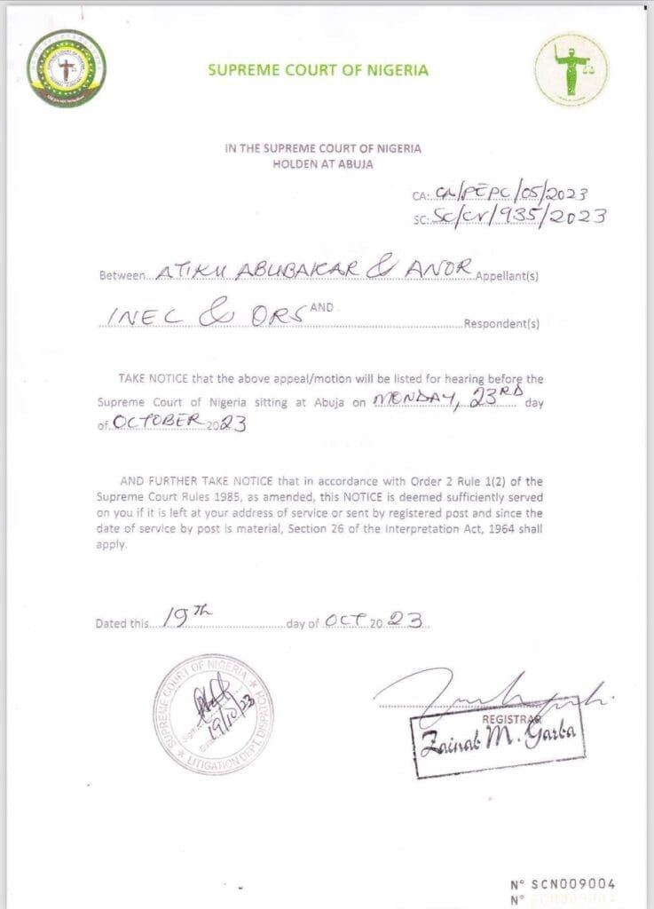 The Supreme Court in Nigeria will on Monday [Oct. 23] hear the petitions against President Bola Tinubu’s election in February. The Court served hearing notices to Peoples Democratic Party’s [PDP], Atiku Abubakar; Labour Party’s [LP], Peter Obi and the Allied Peoples Movement [APM] candidate Chichi Ojei on Thursday.