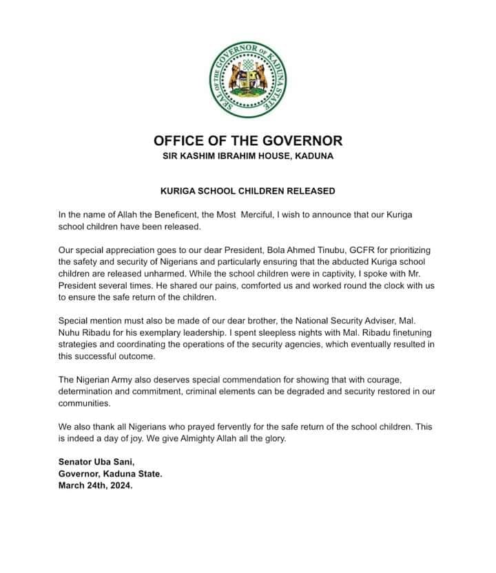 (Kaduna) Kaduna Governor Uba Sani announced Sunday the release of 137 Kuriga students who had been abducted from their government primary school at the start of school on March 7.