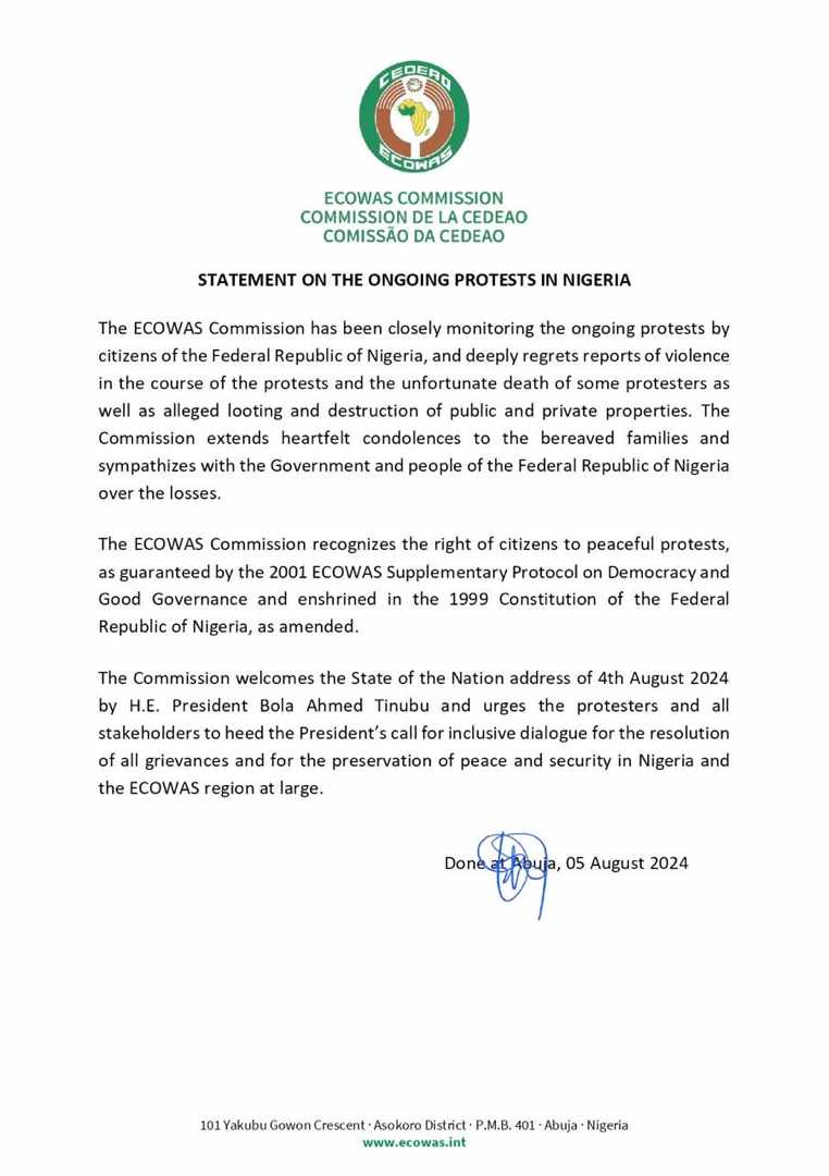 ECOWAS praised President Tinubu’s address to the nation on August 4, 2024 and encouraged all parties to come together for some constructive dialogue. Protesters had defied Tinubu’s plea for suspension of the protests, saying he did not address their demands.
