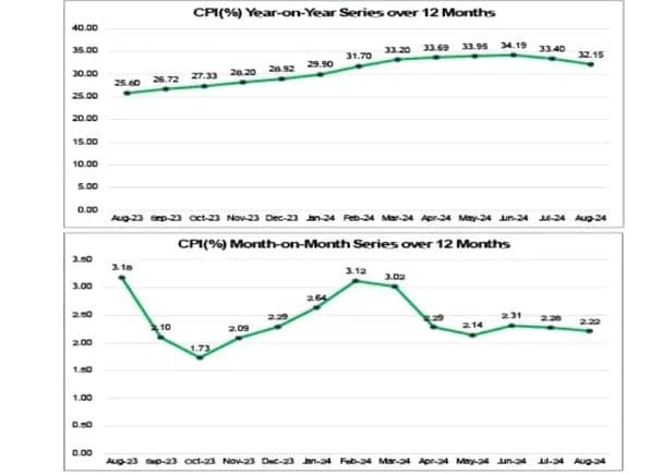 On a year-over-year basis, inflation was 6.35 percentage points higher than the 25.8 percent recorded in August 2023, reflecting a significant price surge over the past year. Month-to-month inflation also eased slightly, standing at 2.22 percent in August, down from 2.28 percent in July.