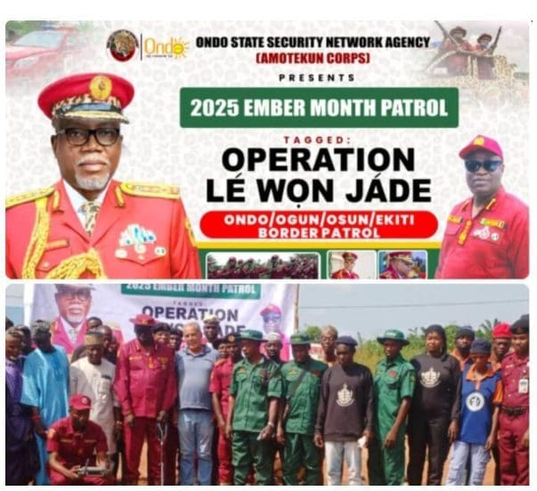 Akure, Ondo state – The Southwest’s regional security outfit, the Ondo State Security Network Agency popularly known as Amotekun (Leopard) flagged off a sweeping border-defense operation titled “Operation Le Won Jade” (Operation Chase Them Out) on November 5, 2025, at the Ajebandele boundary of Ondo and Ogun States, Southwest of Nigeria. The operation is designed to block Fulani Ethnic Militia terrorists and other extremist groups from infiltrating Ondo and neighboring states.