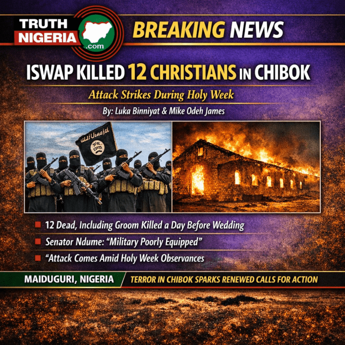 MAIDUGURI — Terrorists of the Islamic State of West Africa Province (ISWAP) killed 12 Christians in an overnight assault on Kautikari, a community near Chibok in Southern Borno, multiple sources — including Dr. Pogu Bitrus, President of the Middle Belt Forum — confirmed to TruthNigeria on Tuesday. The attack, which struck during Holy Week, has plunged the Christian community into fresh grief.